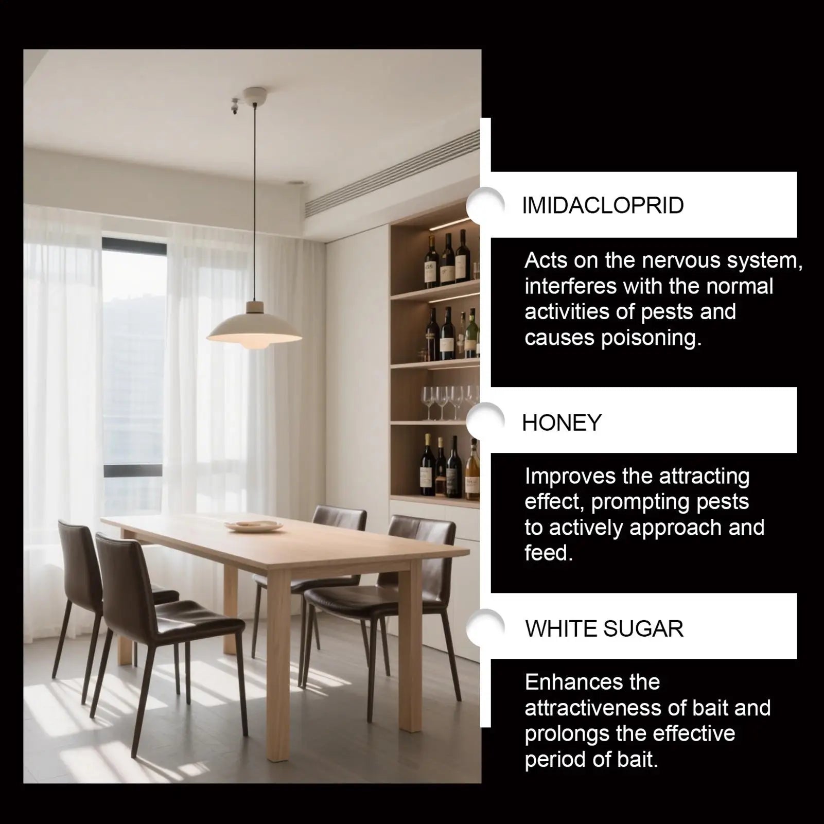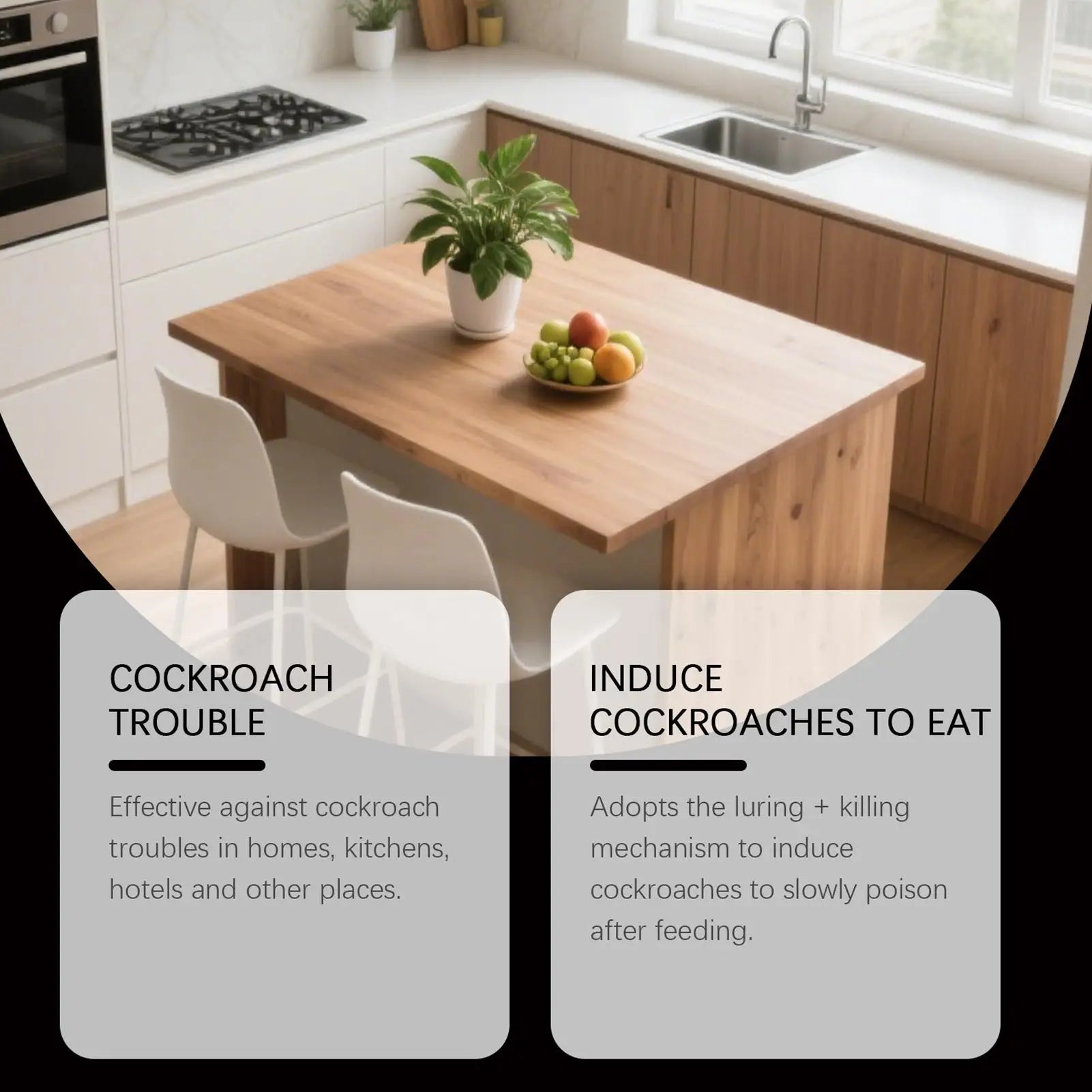 1.Unique Attracting Formula: Achieve efficient roach control with a unique attracting formula that induces active feeding, and targets nests for comprehensive chain elimination