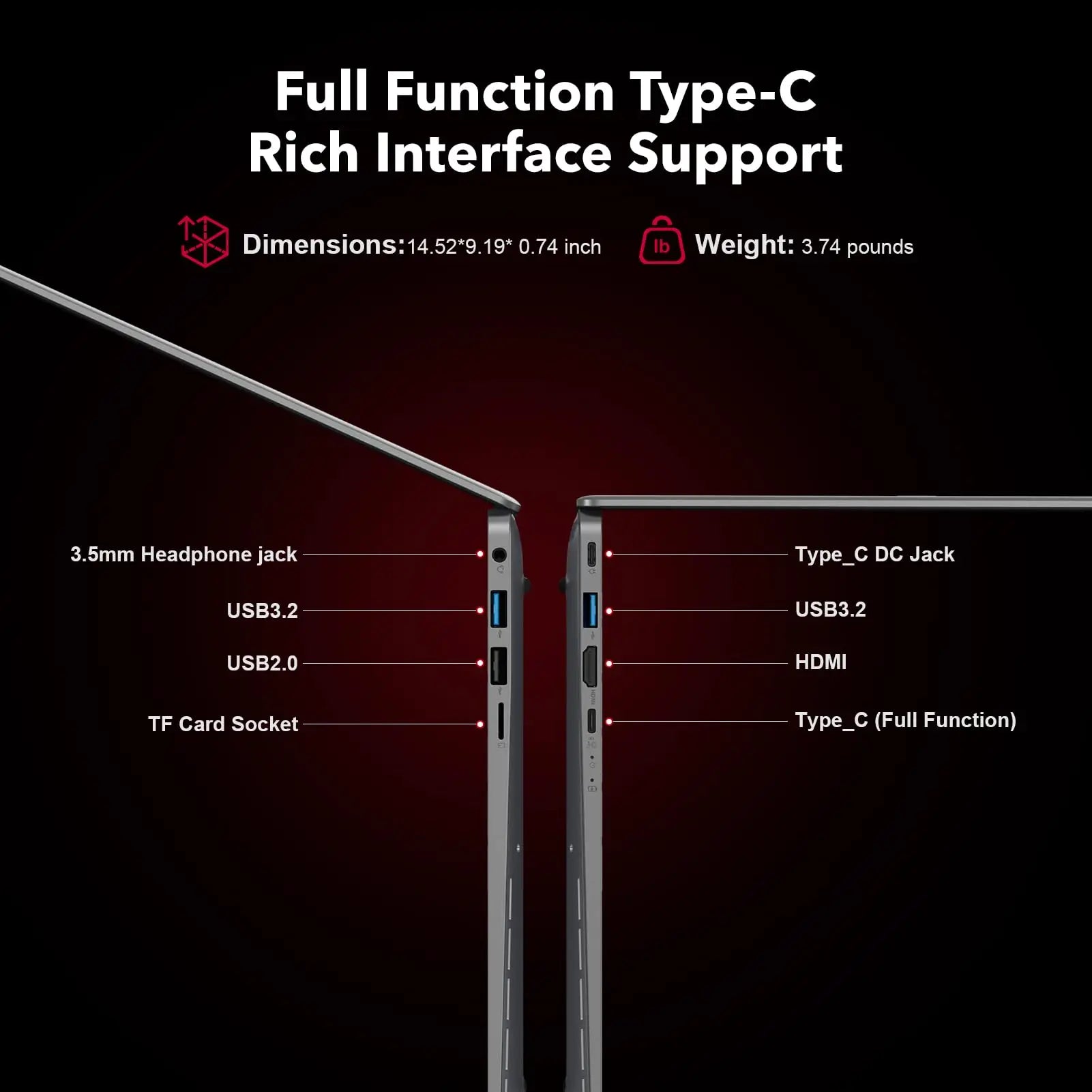 This device, with dimensions of 14.529.190.74 inch and a weight of 3.74 pounds, is compact and portable. It boasts a rich interface: a 3.5mm headphone jack, USB3.2, USB2.0, a TF card socket, a Type - C DC jack, HDMI, and a full - function Type - C port. Whether you need to connect audio devices, transfer data, or extend displays, it meets all your needs, making work and entertainment more convenient.