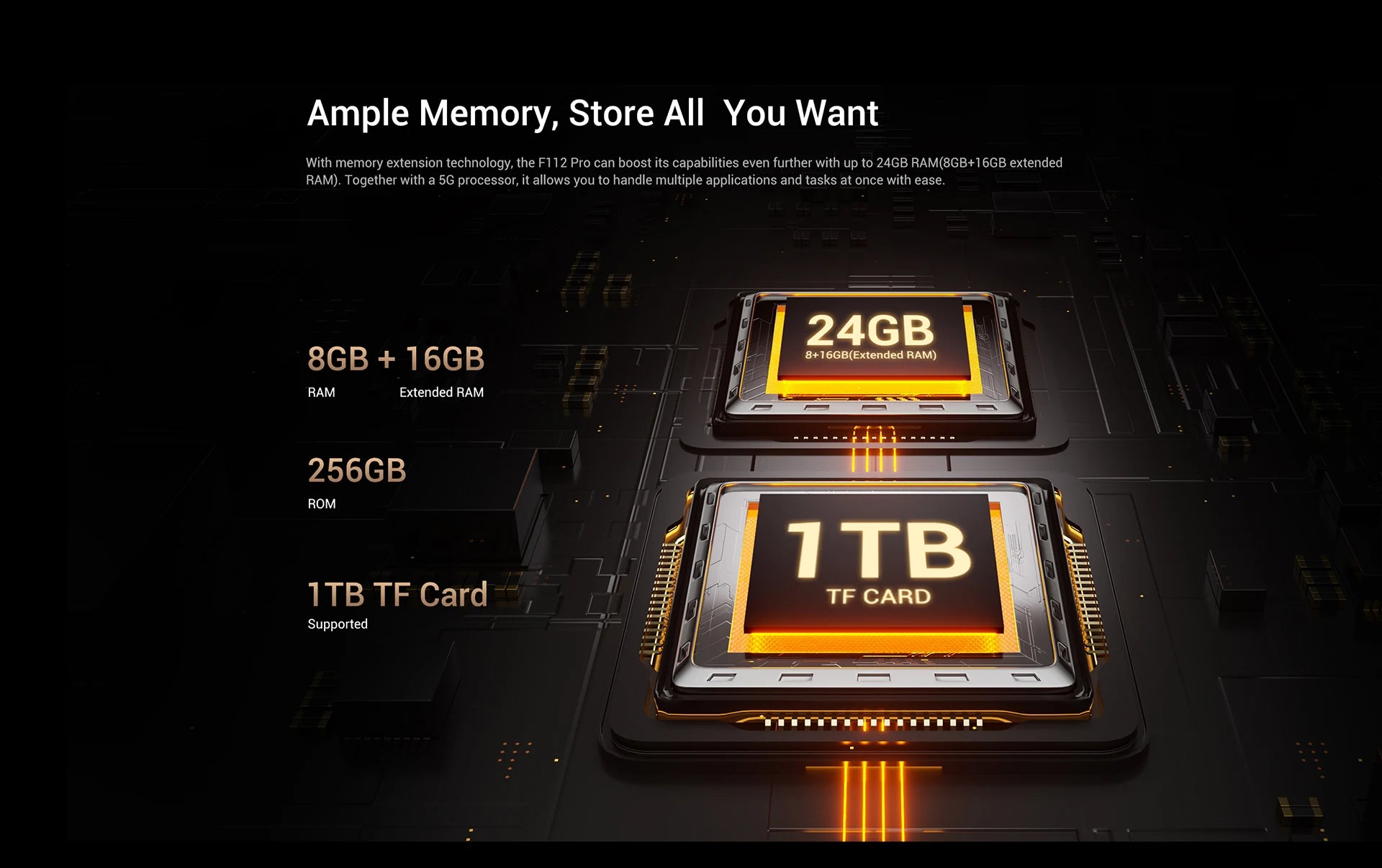 With memory extension technology, the F112 Pro can boost its capabilities even further with up to 24GB RAM(8GB+16GB extended
