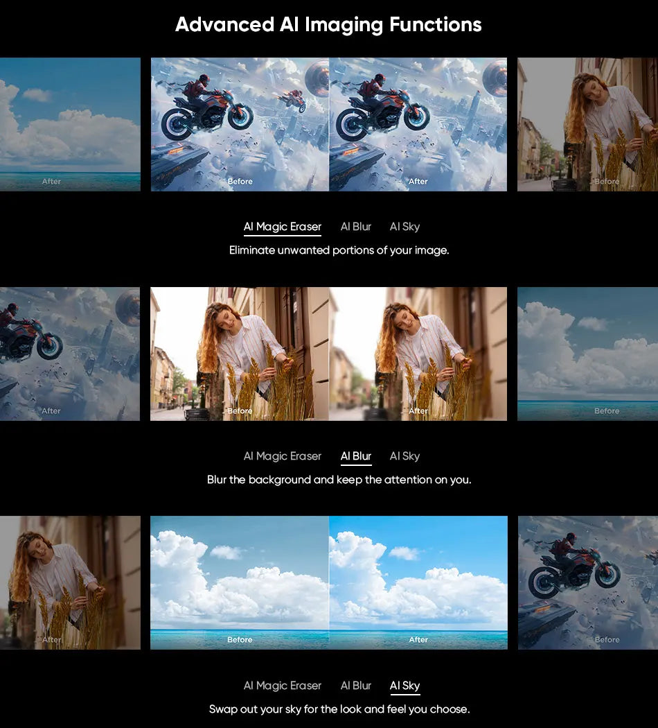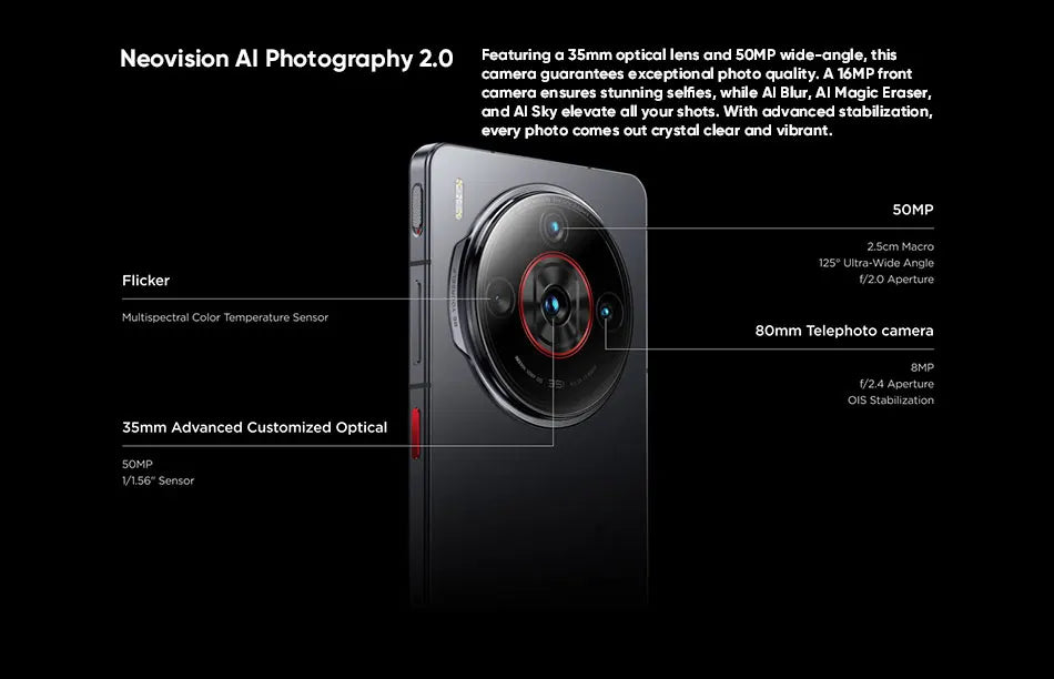 >Camera --- Rear camera:50M(35mm IMX906 OIS,1/1.56inch 1.0um, 4in1,1G+6P F/1.59,QPD)+50MUltra-Wide Angle(AF,OV50D,2.5cm,DFOV=120.4°,125°,13mm) +8M (3X,Hynix847 1/4.4inch 1.0um pixel size 5P F/2.4,80mm) ,Flicker