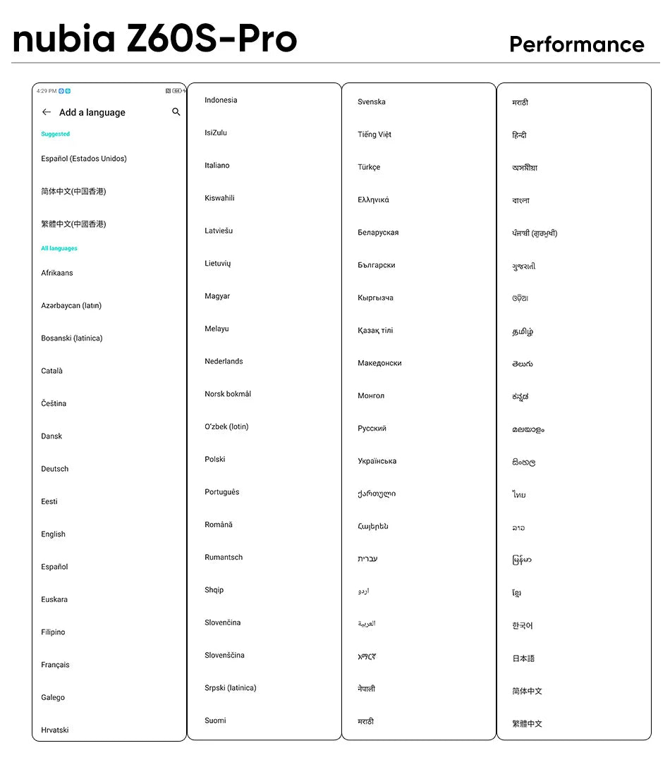 >In the box: nubia Z60S Pro × 1, Screen protector × 1, Clear phone case × 1, Charger × 1, Type-C data cable × 1, SIM tray ejector x 1,Quick Start Guide *1,Warranty Card *1