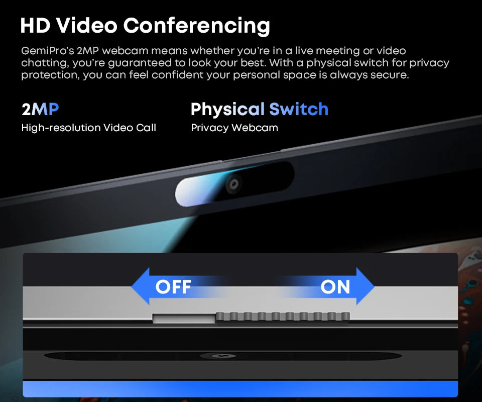 GemiPro's 2MP webcam means whether you're in a live meeting or videochatting, you're guaranteed to look your best. With a physical switch for privacyprotection, you can feel confident your personal space is always secure.All the Ports You Need