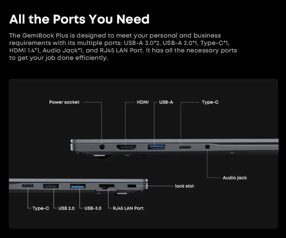 The GemiBook Plus is designed to meet your personal and businessrequirements with its multiple ports: USB-A 3.0*2, USB-A 2.0*1, Type-C*1,HDMI1.4*1 Audio Jack*1, and RJ45 LAN Port.lt has all the necessary portsto get your job done efficiently.
