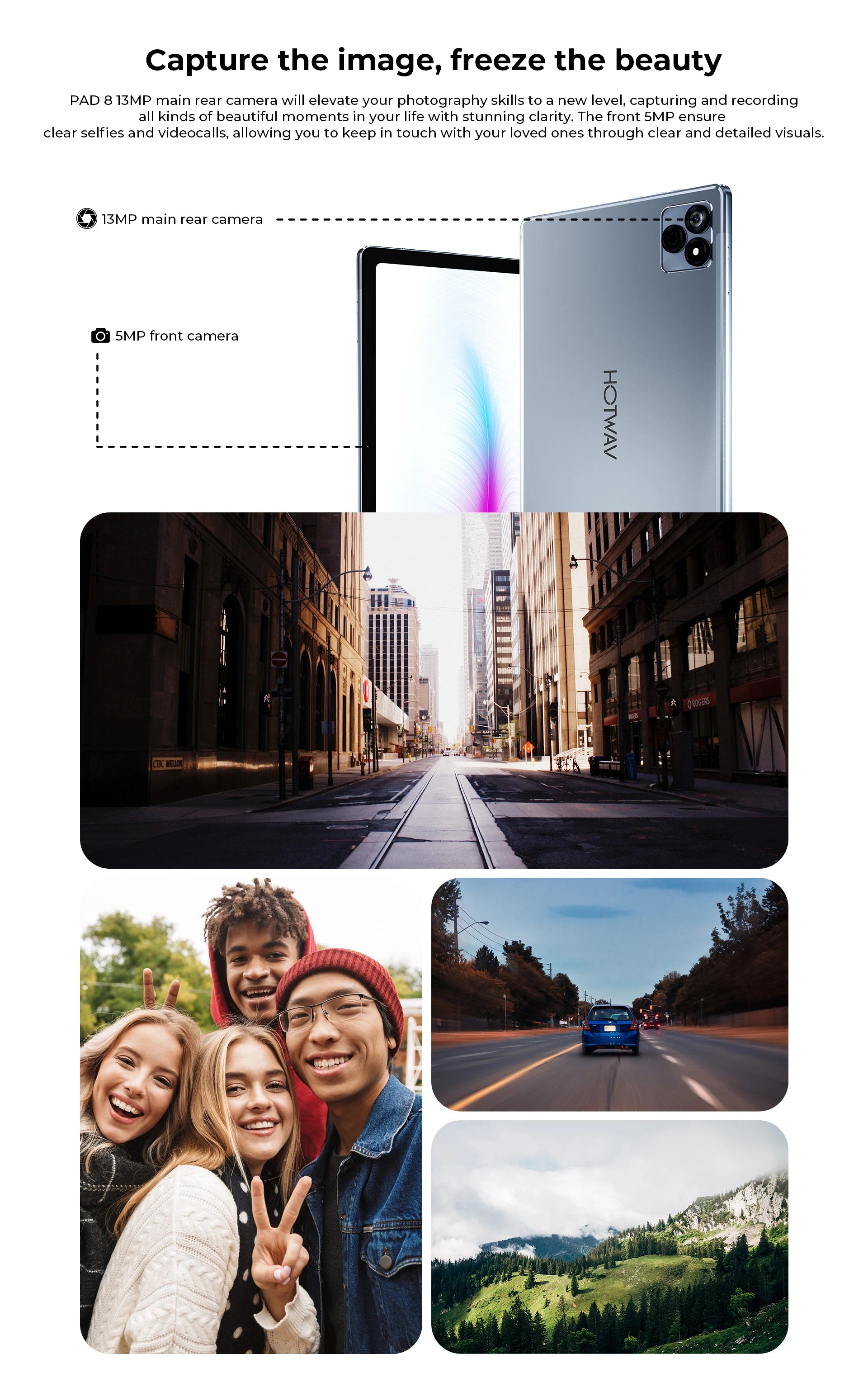 Pad 8 13MP main rear camera will elevate your photography skills to a new level, capturing and recording all kinds of beautiful moments in your life with stunning clarity. The front 5MP ensure clear selfies and videocalls, allowing you to keep in touch with your loved ones through clear and detailed visuals.