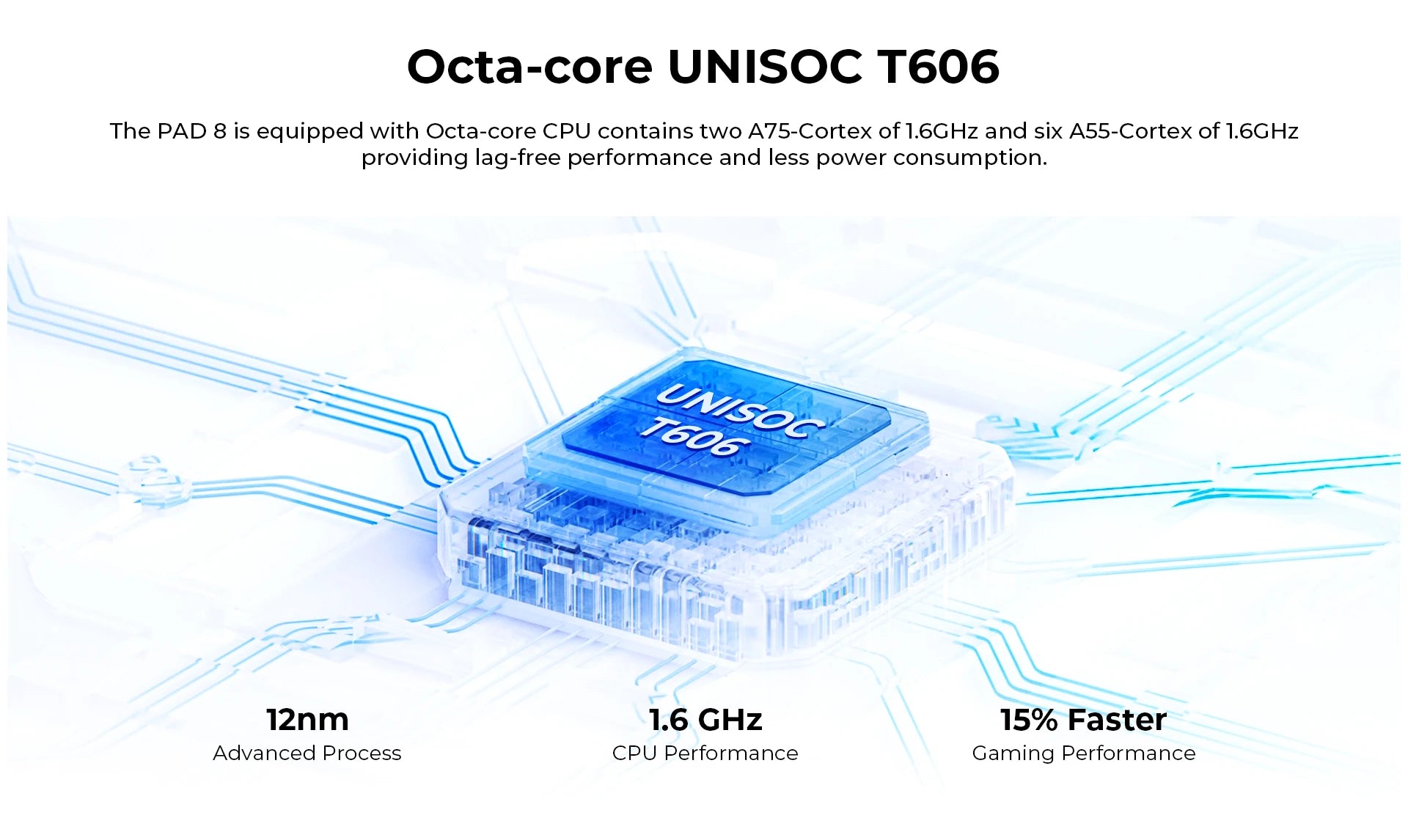 The PAD 8 is equipped with Octa-core CPU contains two A75-Cortex of 1.6CHz and six A55-Cortex of 1.6GHz