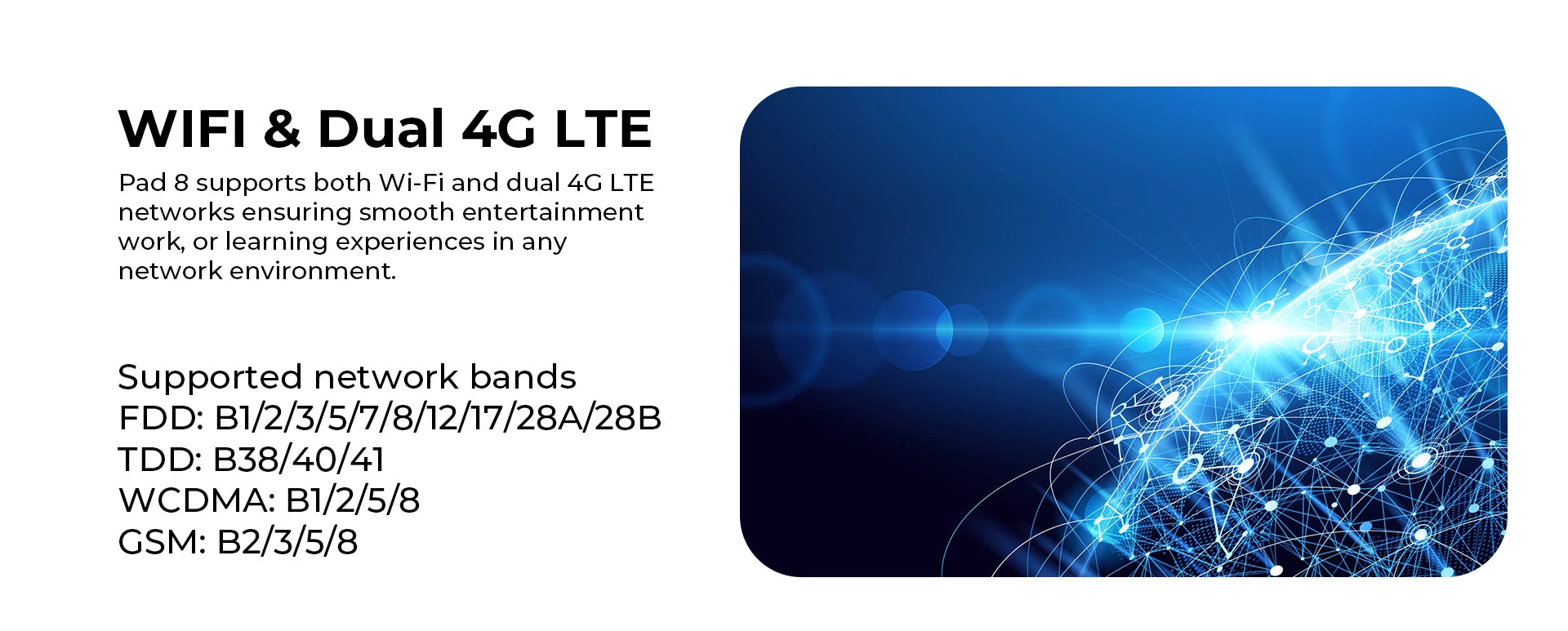 Pad 8 supports both Wi-Fi and dual 4G LTE networks ensuring smooth entertainment, work, or learning experiences in any