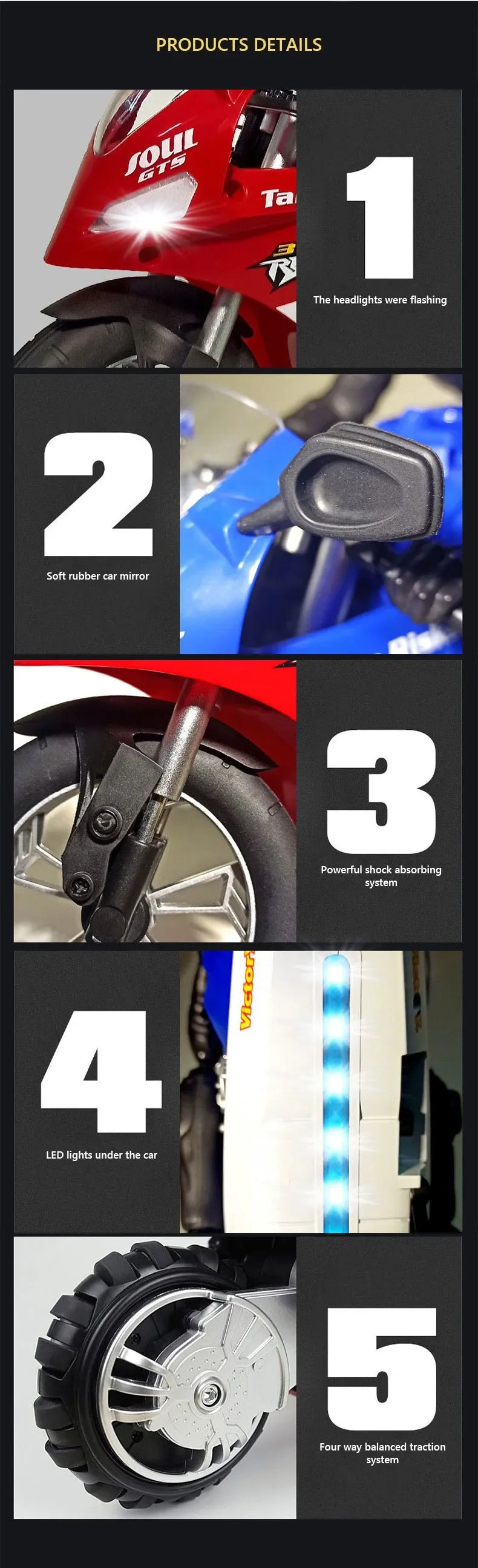 2. The product can be self-stabilized and balanced through the traction control of the rear rubber balance wheel, subverting traditional remote control motorcycle toys.