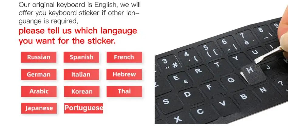 2, It is English keyboard, we offer free keyboard sticker for some languages such as Russian, Portuguese, Arabic, Spanish, etc.