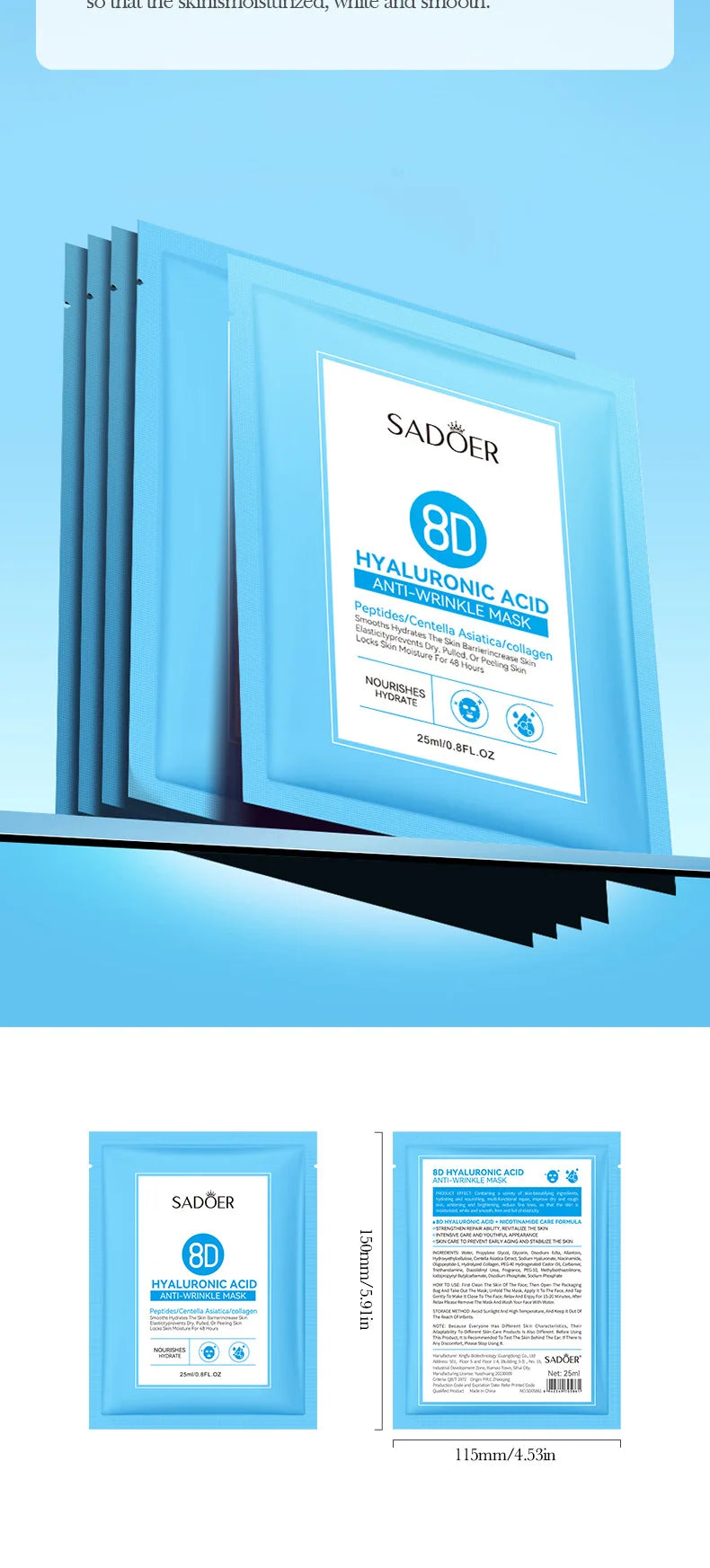 5pcs SADOER 8D Hyaluronic Acid Face Mask Anti Wrinkle Facial Moisturizing Nourishing Firming Hydrating Facial Mask Skin Care