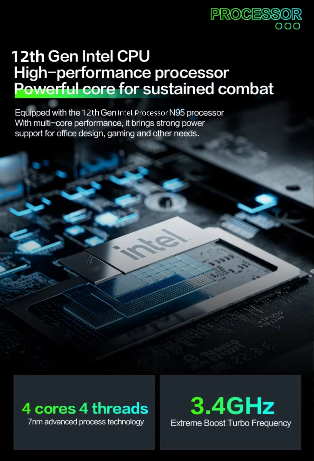 -Intel Procesador N95, 4-Core, 4-Threads, up to 3.4GHz