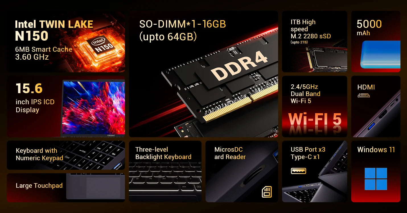 Firebat Laptop AT15 15.6 Inch Intel N150 DDR4 16GB RAM 512GB 1TB SSD 1920*1080 Windows 11 Notebook Backlit Integrated Numpad