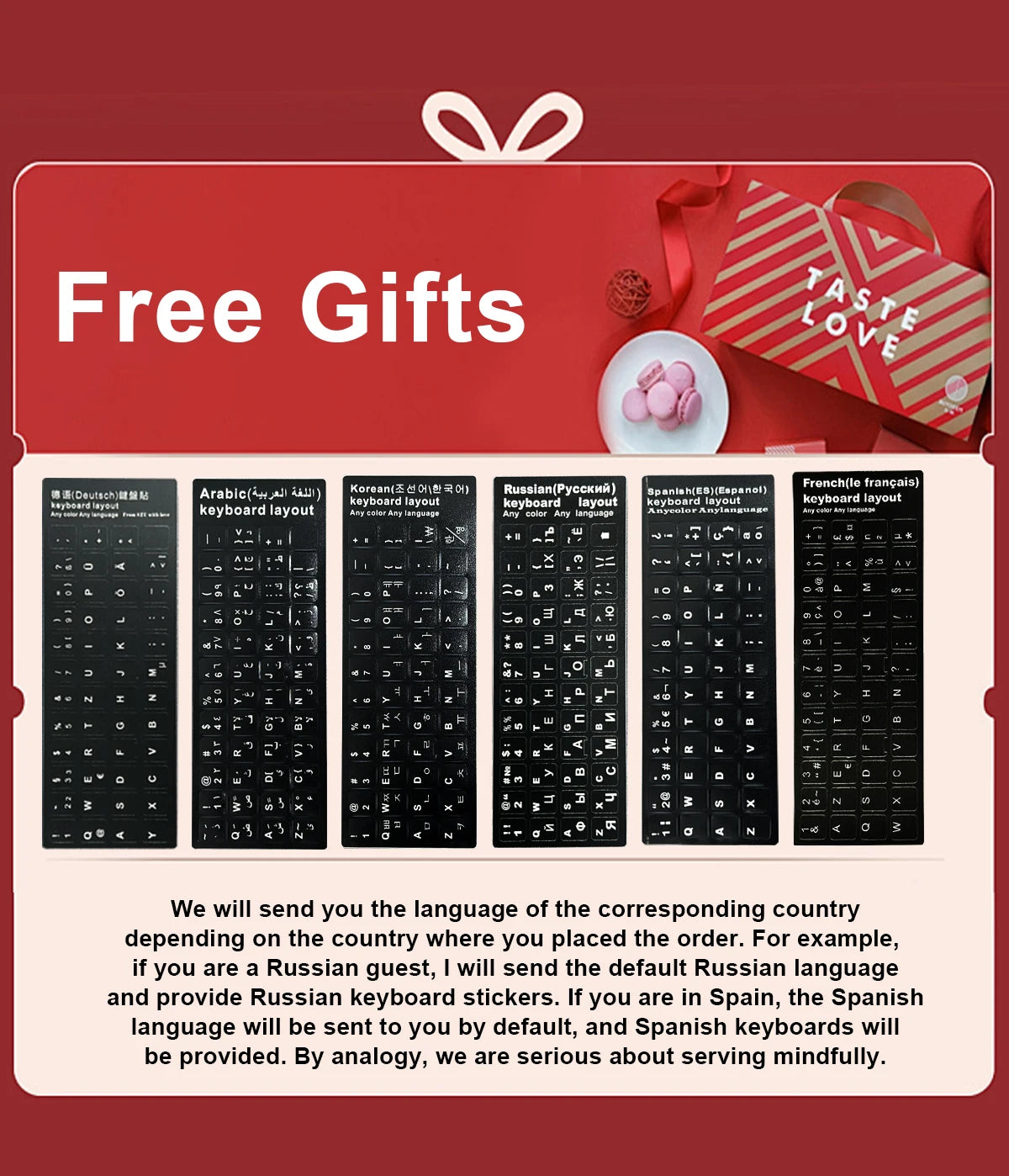 -- Our keyboard is QWERTY English standard version, but we will send keyboard stickers of other languages below as a gift. If you need it, just leave us a message. Keyboard stickers: Russian, Spanish, French, German, Italian, , Arabic, Turkish, Thai, Japanese, Korean.